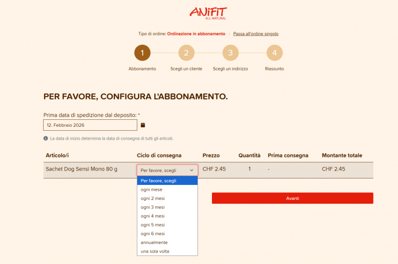 IMPORTANTE: Regola la data di spedizione desiderata ogni volta che cambi l'abbonamento, altrimenti il tuo abbonamento sarà spedito il giorno successivo.